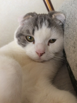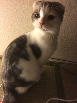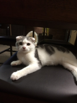白にグレーのブチ。とても人なつこい男の子です。マイクロチップ有り。