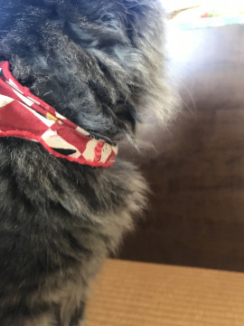 長毛キジトラ雑種。5.5kg フサフサなのでちょっと大きく見えます。お寿司模様の三角のバンダナ風首輪をしています。完全室内飼い。去勢済みのオスです。マイクロチップも入っています。名前はヘンリーですが、義父が「くろ」夫も「くろたん」と呼びます。