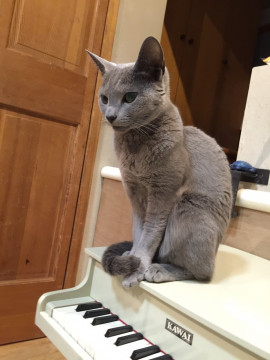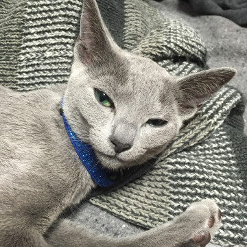 グレーの体毛、ライトグリーンの瞳のロシアンブルー。