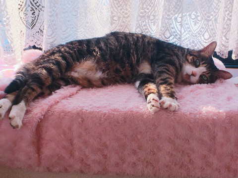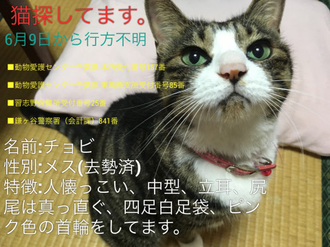 特徴はキジトラで四足白足袋。ピンク色の首輪をしてます。届出済。懐っこい性格です。情報宜しくお願いします。