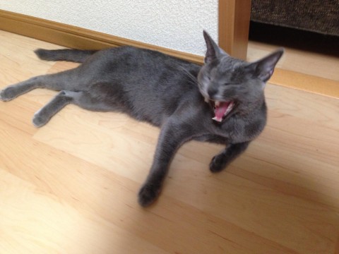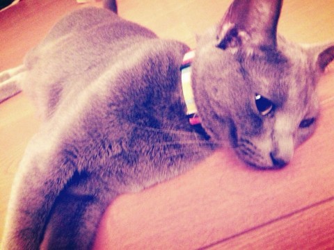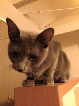 ロシアンブルー3歳♀です。体が小さく2.4kgしかありません。赤い首輪をしています。こわがりで警戒心が強いです。