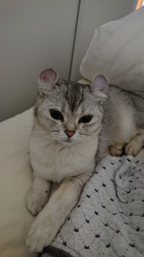 グレーと白の中毛のアメリカンカール、耳が後ろに反っています。前からみると耳が丸く見えます。
