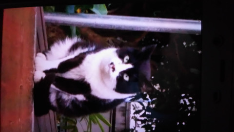 背中が黒、お腹が白のツートンカラー。チョビヒゲのハチワレ。しっぽはまっすぐで長いです。