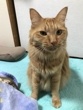 黄土色、薄いオレンジ色とも取れる色合いをしています。全体的に毛の量が多めで、ふさふさしてます。