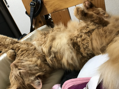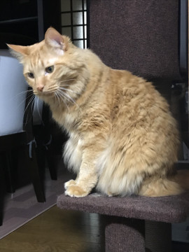 鳴き声はたまに猫っぽい時もあるし、犬っぽい時もあり、抱っ越されて嫌な時は尻尾をブンブン振り回します。雑種のメインクーンなので大きいです。