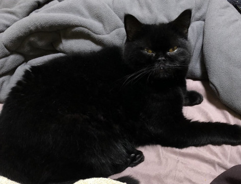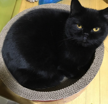 スコティッシュの立ち耳の黒猫です。目は黄色。