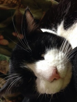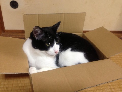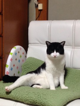 白と黒のハチワレです。去勢済みです。少し高い声で鳴きます。