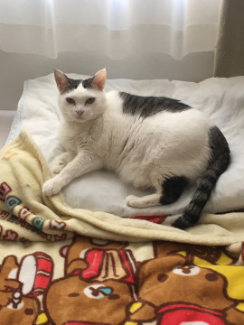 ハチワレ、背中は柄あり、お腹シロ、体重6.5