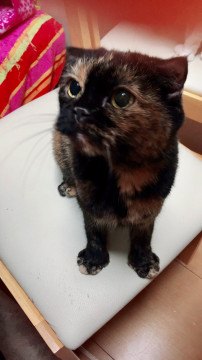 黒茶薄茶のサビ色のスコティッシュの女の子です。人懐こく、鳴き声が小さいのが特徴