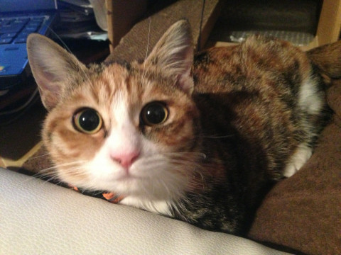 目が大きくて、体格は結構ぽっちゃりした猫です。若草色の唐草模様の首輪をしています。