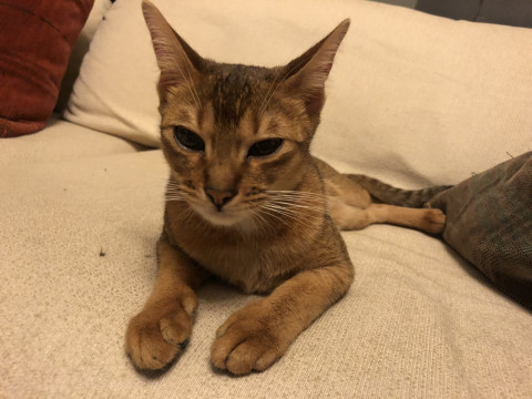 猫が家から逃げてしまいました。名前は小梅、種類はアビシニアン、色はルディ(こげ茶色、アゴの下が白、おでこと尻尾の先が少ししましま)、10カ月齢の女の子。体重2キロの細身。人見知りで臆病です。今まで一度も家から出たことない完全室内飼い猫ですので、自力では帰ってこれないと思うのでとても心配です。チュールとロイヤルカナンのウェットフードが好きです。お腹がすいてご飯がほしいときはにゃーと小さな可愛い声で鳴きます。