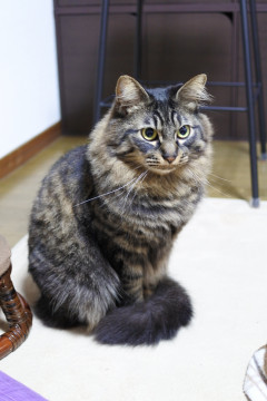 全体に黒っぽい茶色。中毛でしっぽが長め。ひげが長く耳と目が大きい。若いオス猫ですが、早くに去勢手術をしており、おとなしく、とても怖がりです。首輪などはしていません。どうぞよろしくお願いします。