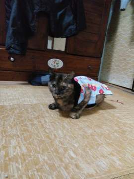 さび柄で顔つきは男っぽいです。赤っぽい首輪をしています。避妊手術済みです。