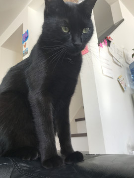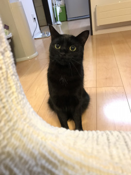 丸顔の黒猫です。子猫の様な声で鳴きます。首に白い毛が少し生えています。全体的に細い感じの子です。普段は室内飼いなので、外に慣れておらず大きな音などにすごくびっくりします。