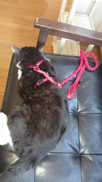夕方 外を恋しがるのでハーネスつけて外に出したところ 振り切って脱走。赤い色のハーネス型リードつけたままです。