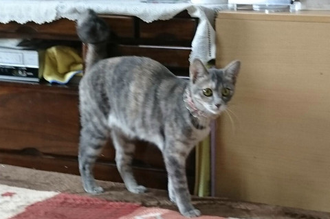 尻尾はカギ尻尾で、赤い紐の首輪をしていて、鈴が付いています。