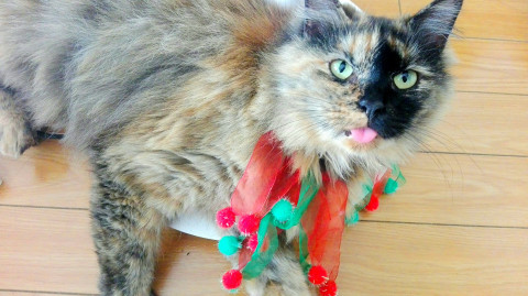 さび柄で、顔の左半分が黒く、尻尾が短いです。アレルギー皮膚炎で首やお腹に湿疹があります。首の周りのリンパが腫れています。避妊済みです。