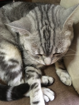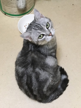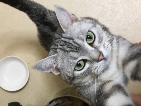 白と黒に近いグレーのシルバータビーのアメリカンショートヘアです。ぽっちゃりしていて臆病者です。