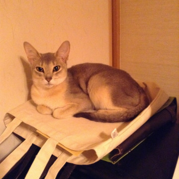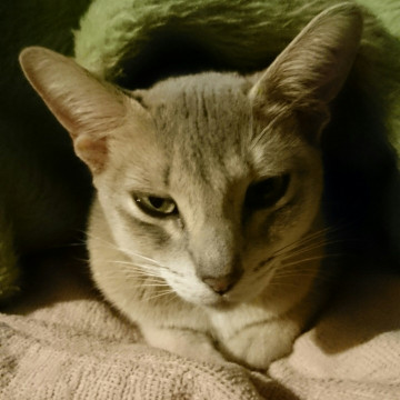灰色のアビシニアンで、シッボが長く大きな耳をしています。