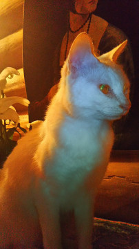 真っ白で頭のところに数本黒い線が入っている。目は黄色。細めの中肉中背でかわいいお顔をしている。尻尾は長め。