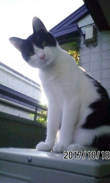 はちわれ 黒白 瞳キイロ 尻尾長くて黒い 首輪なし