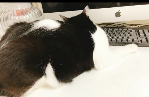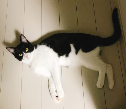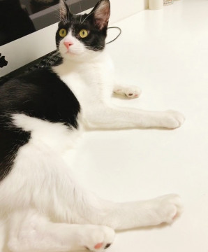 背中に白いイカのようなマークがある白黒ハチワレです。