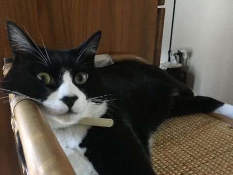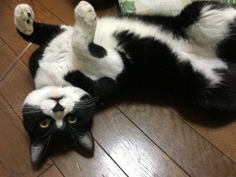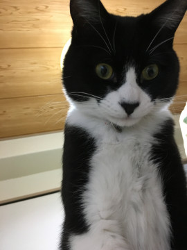 ハチワレで黒肉球、アーミー柄の首輪をしています。