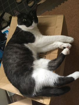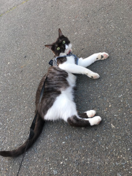 背中はクロトラ柄、お腹は白く口の部分は左右で白とトラがら非対称模様。後ろ足の真ん中だけトラ模様、中型で誰にでも付いて行く程です。