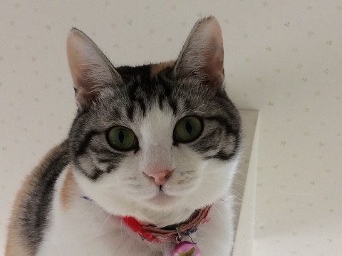 白、黒、茶のしま三毛。鈴の付いた赤い首輪。桜猫。