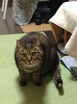 ドラえもん体型のぽっちゃりキジトラ猫です。顔はまん丸、アイラインくっきりのグリーンの大きな目、ちょっと短い手足が特徴です。顔、身体の縞が全体的に濃いです。