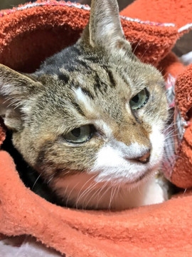 キジ白で目ヤニが多く、赤い首輪をしています。(首輪に連絡先も書いてあります)