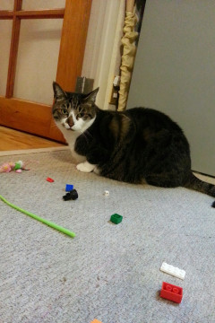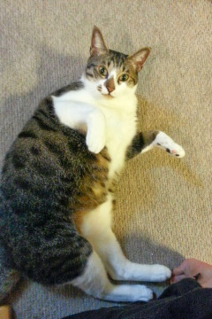 アメリカンショートヘア系統の雑種です。黒と灰色のしま模様です。8㎏あり、大変太っています。しっぽは長いです。首輪はしておりません。去勢済みです。