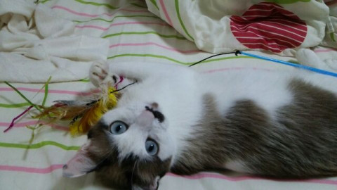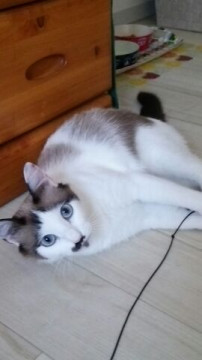 見た目はシャム猫の雑種ぽいです。目はブルーです。