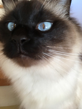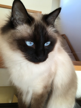 写真よりもっと長毛でシャム猫のような柄です。尻尾はこげ茶で長くふわっとしてます。目はブルーです。