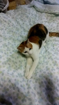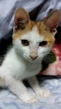 頭は赤茶で黒が少し混ざっています。背中は黒と赤茶で両肩からお腹は白です。今まで家の中でしか飼っていなかったので、食べ物もキャットフードしか食べません。