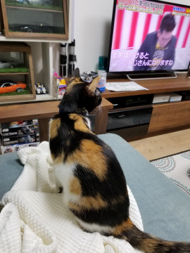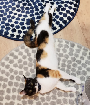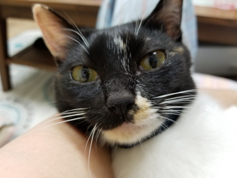 お顔は黒のハチワレ気味でお腹は白の三毛猫