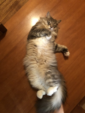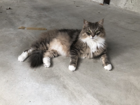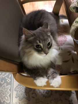 黒みがかった茶色のサバトラであごの下やお腹、前足後ろ足が白い長毛種です。