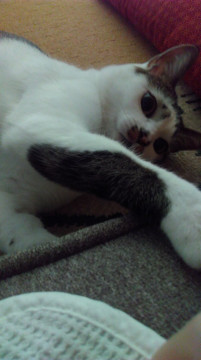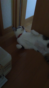 お腹に去勢手術の跡があり、毛が剃ってあります。臆病です。