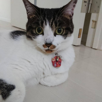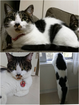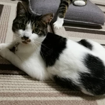 キジシロの女の子です(顔はハチワレ、身体は白ベースでキジ模様のブチがいくつかあります。)尻尾が長く、口元にちょびひげの模様が入っています。