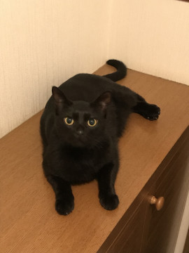 黒猫。お腹の真ん中あたりが少し白いです。鳴き声が一般的な猫とはちょっと違い、ミャッと鳴くことが多いです。臆病な人見知りなので近づくと逃げるかもしれません。