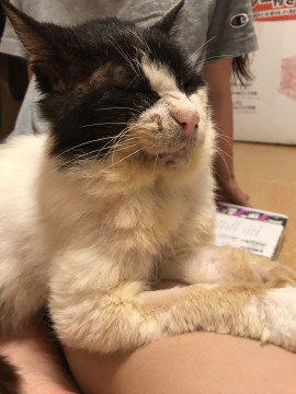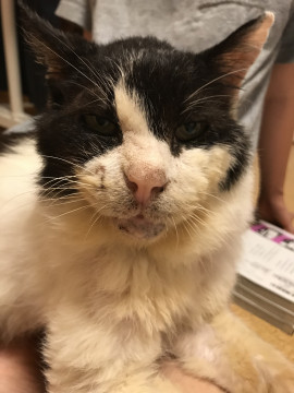 白黒ハチワレで顔は大きいですが身体はとても痩せています。