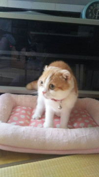 白地に薄茶色の縞模様です。尻尾が太短いです。