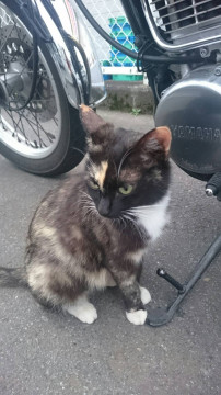 さび柄、しっぽは長めです。撫でるのは平気ですが、抱っこはいやがります。少し人見知りです。