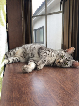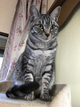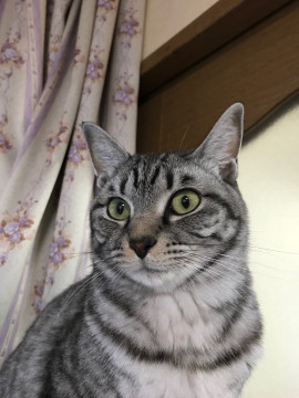 小顔の鼻筋のとおった雑種のサバトラ猫です。体重4.3キロ。痩せ型、長い尻尾、お腹の皮がたるんでいます。完全室内飼いです。名前を呼ぶと返事をする愛想のいい子ですが、知らない人には近づかないかもしれません。