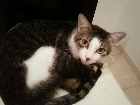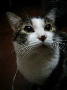 白&黒茶、4.6kgやせ形、人懐こい、去勢済、首輪等つけてません