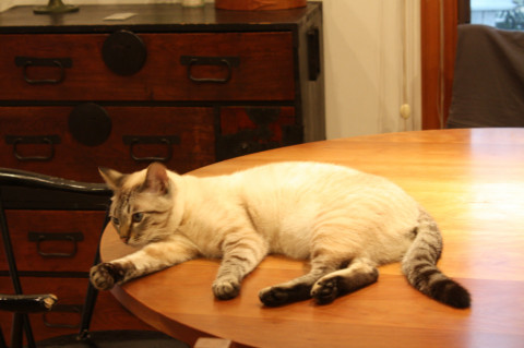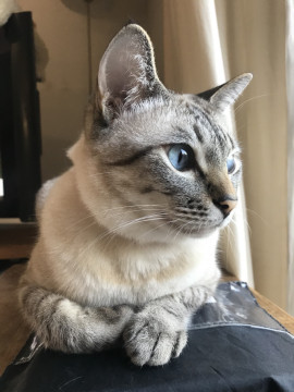 青い目で、おでこに模様、背中はやや黒く、しましまの尻尾で赤い首輪(鈴付き)をしています。足の裏(肉球)は黒です。気が小さく、音に敏感です。体は大きい方です。
