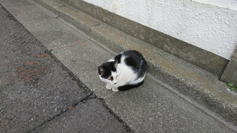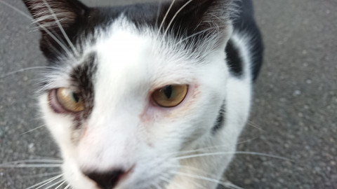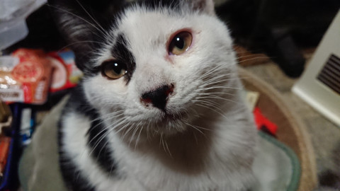 白が多い白黒猫 結膜炎治療中で目やにが多い 右目に黒模様