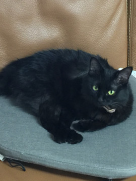 黒猫で毛が長く、リボンのついた赤のチェックの首輪をしています。どちらかと言うと警戒するタイプです。4キロ位なのでそこそこ大きく見えるかもです。
