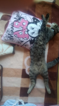 人なつっこくサバとら柄の色で青い鈴つきの首輪をしています。