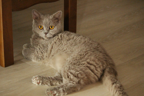 目は黄色、毛が癖っ毛のように特に首回りはカールしてます。ベージュです。柄なし。